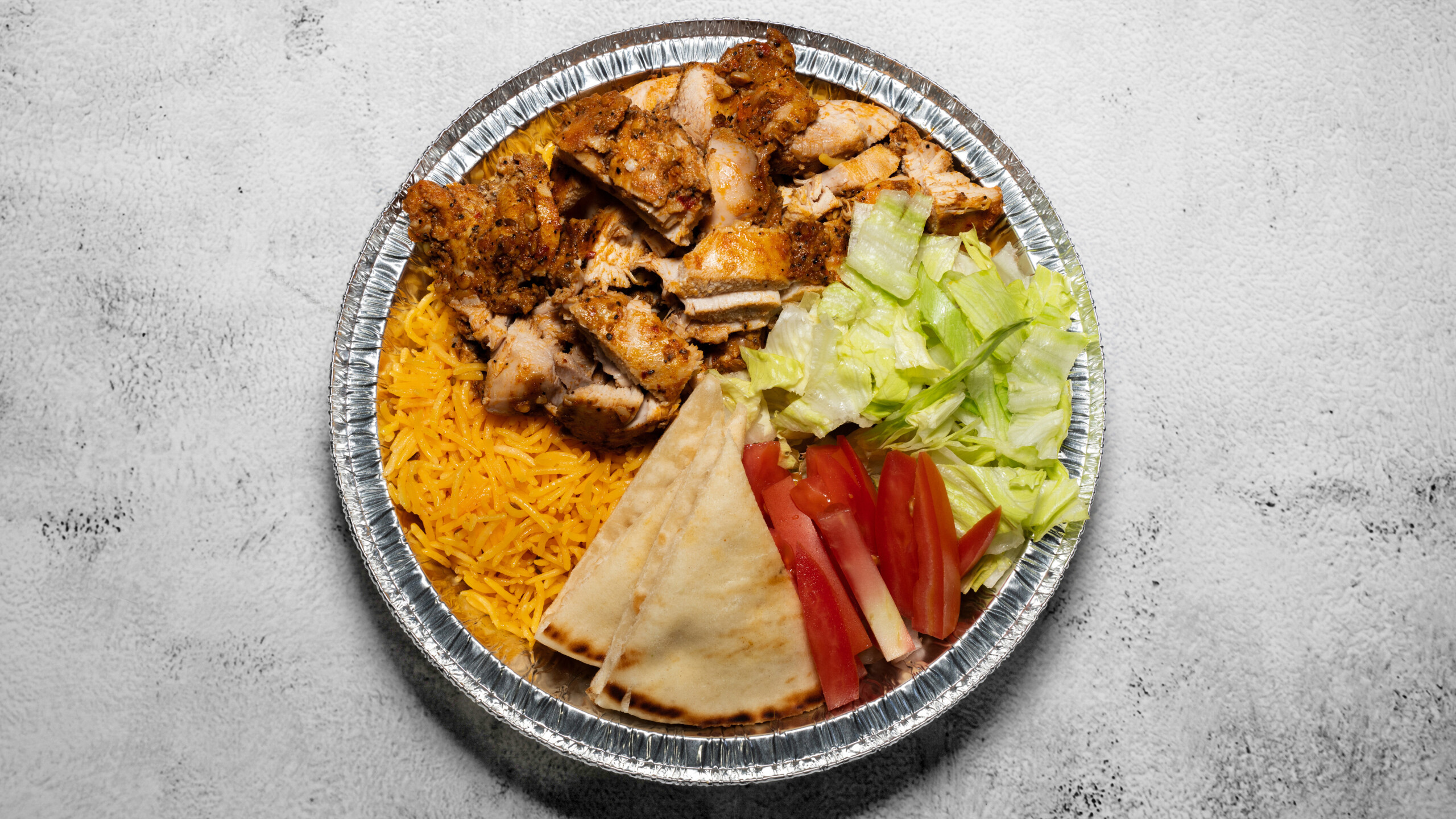 Beef cooked on Char-Broil grill, served over saffron cilantro lime rice with fresh salad, tomatoes, herbs, pita bread, and famous in-house crafted sauces. $16.50