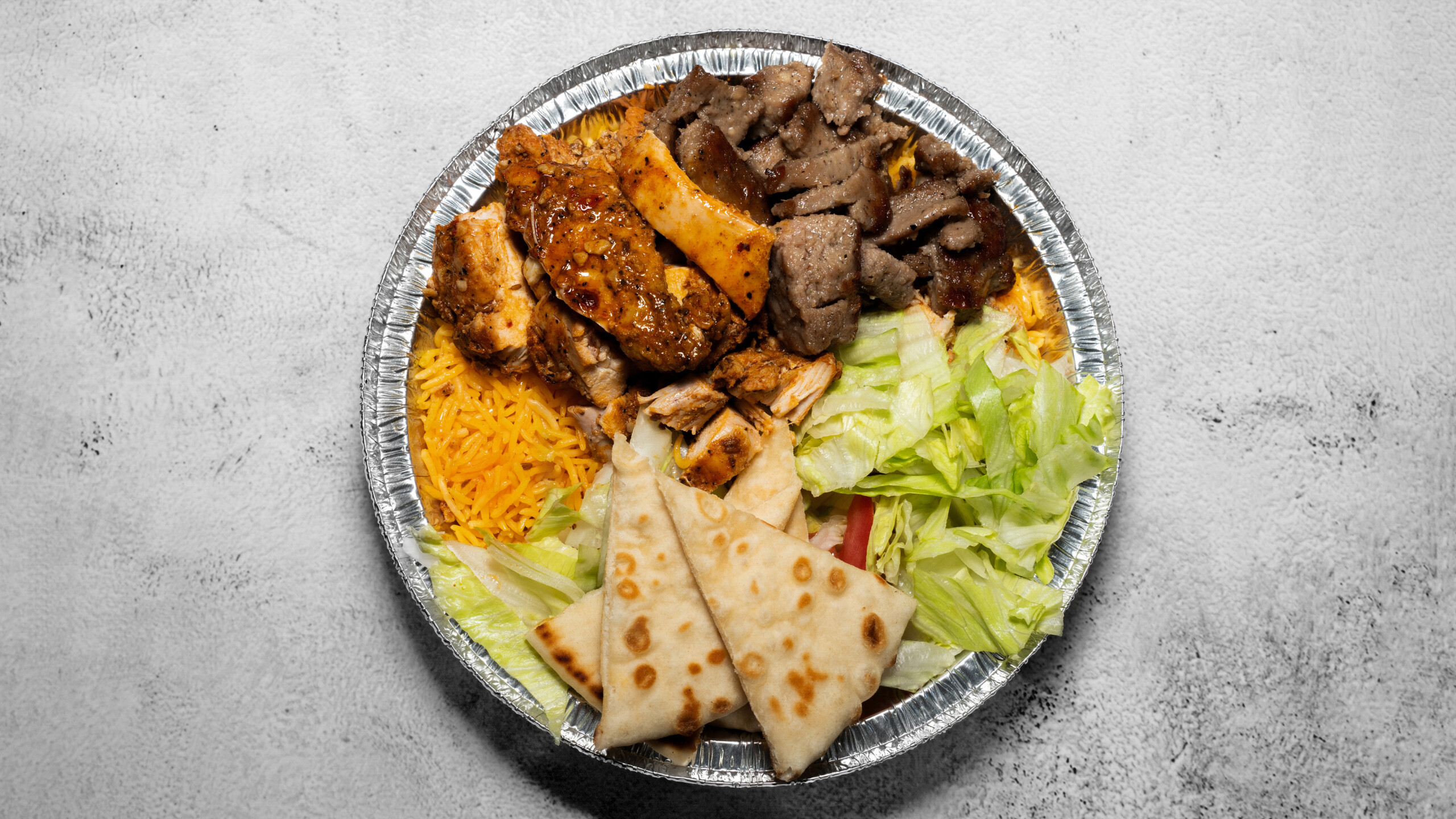 Two proteins (chicken, beef, gyro, or falafel), served over saffron cilantro lime rice with fresh salad, tomatoes, herbs, pita bread, and famous in-house crafted sauces. $16.50
