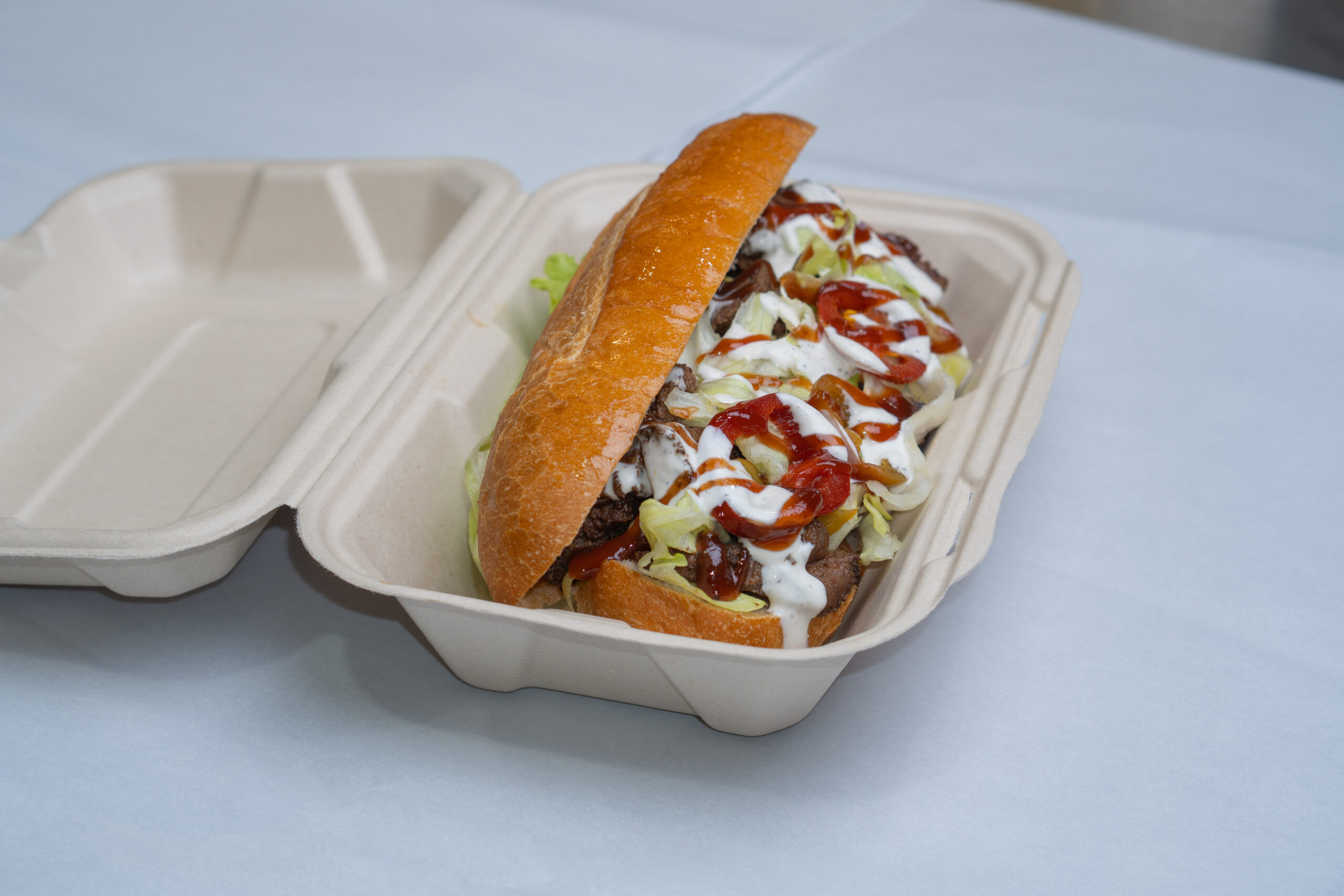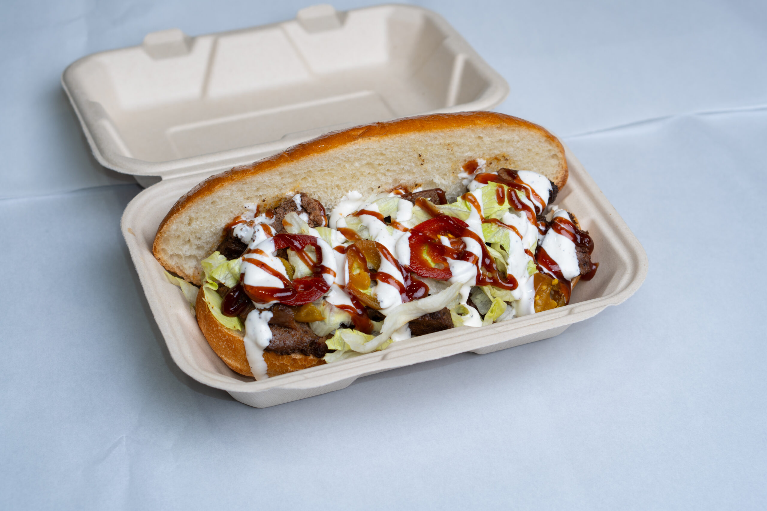 Marinated halal chicken cooked on rotisserie, paired with fresh lettuce, cherry peppers, and crafted sauces, all served on a soft roll. $16.50