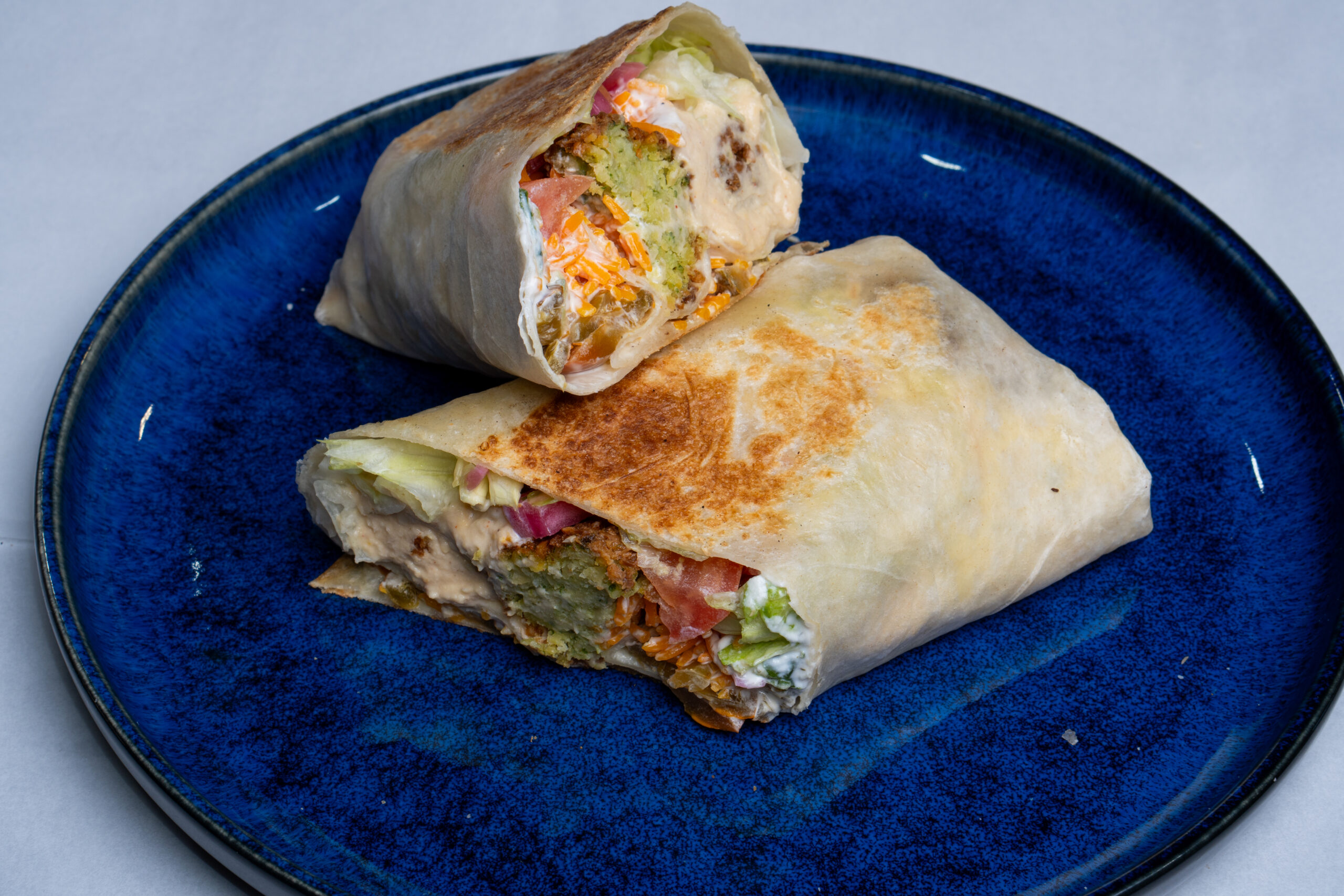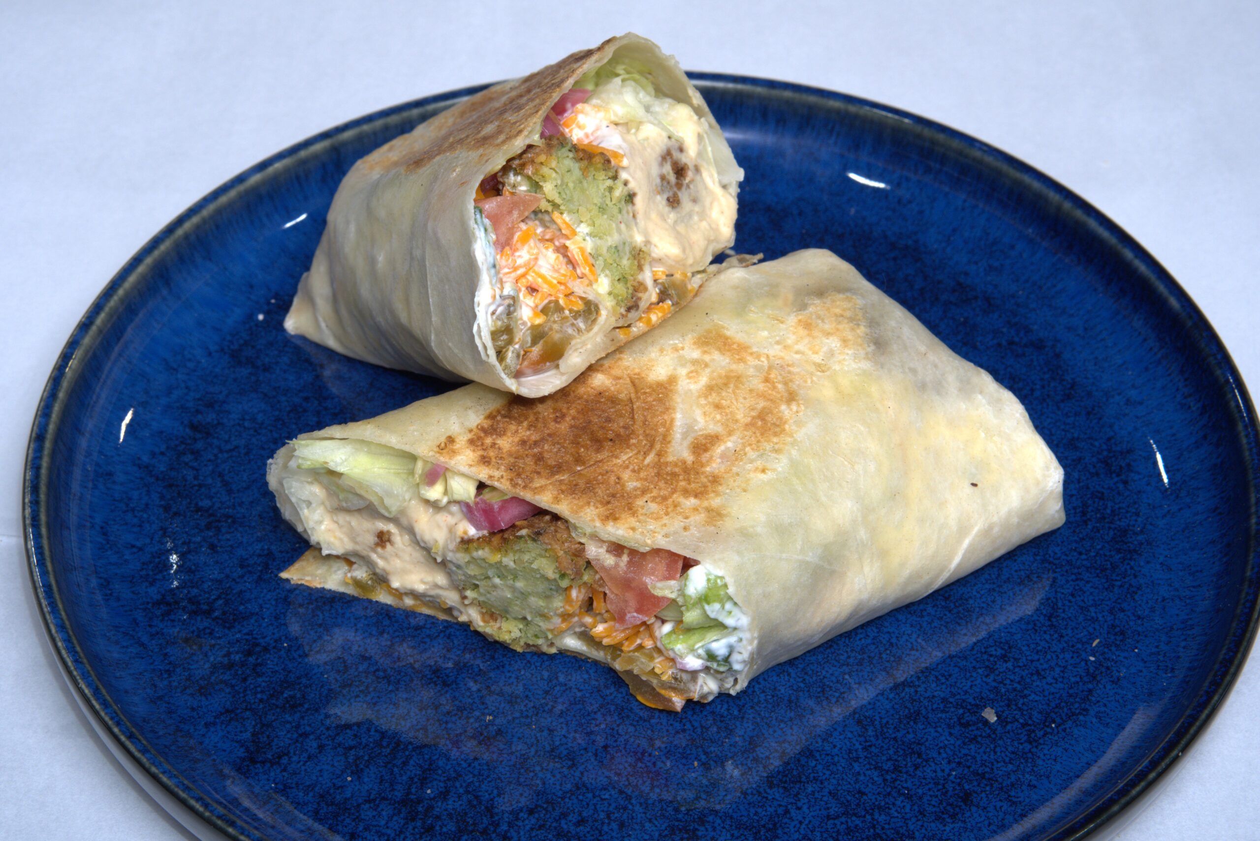 Falafel, fresh salad, tomatoes, pickled onions, herbs, tzatziki, hummus, and crafted sauces, all wrapped in artisan tortilla bread. $16.50