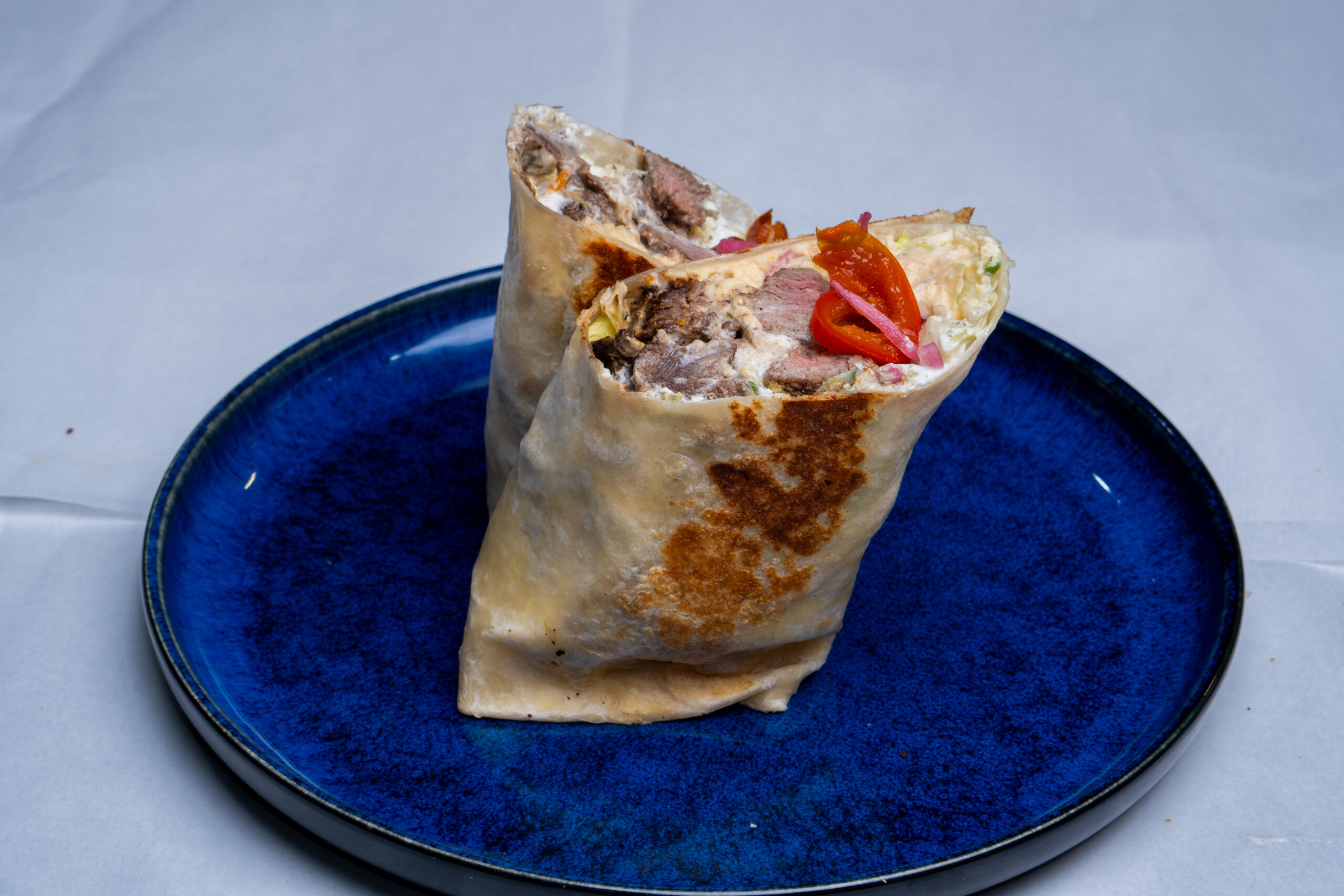 Marinated beef cooked on Char-Broil grill, fresh salad, tomatoes, pickled onions, herbs, tzatziki, hummus, and crafted sauces, all wrapped in artisan tortilla bread. $16.50