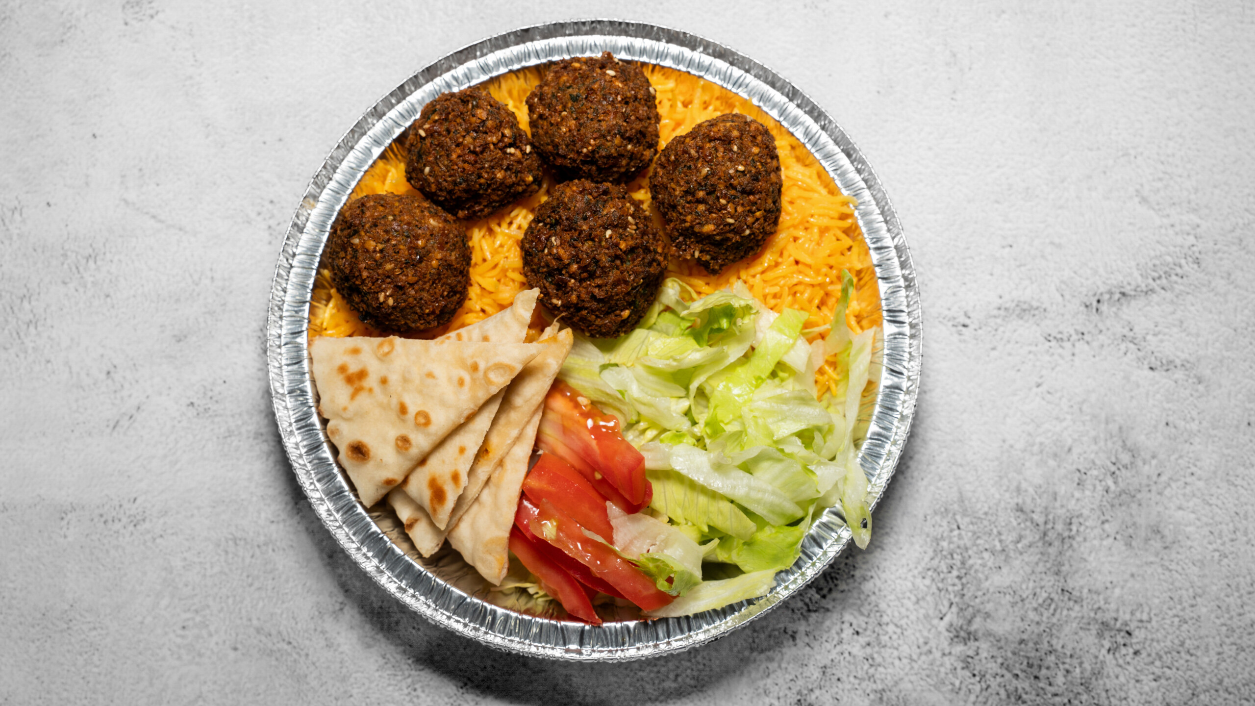 Crispy Falafel, served over saffron cilantro lime rice with fresh salad, tomatoes, herbs, pita bread, and famous in-house crafted sauces. $16.50