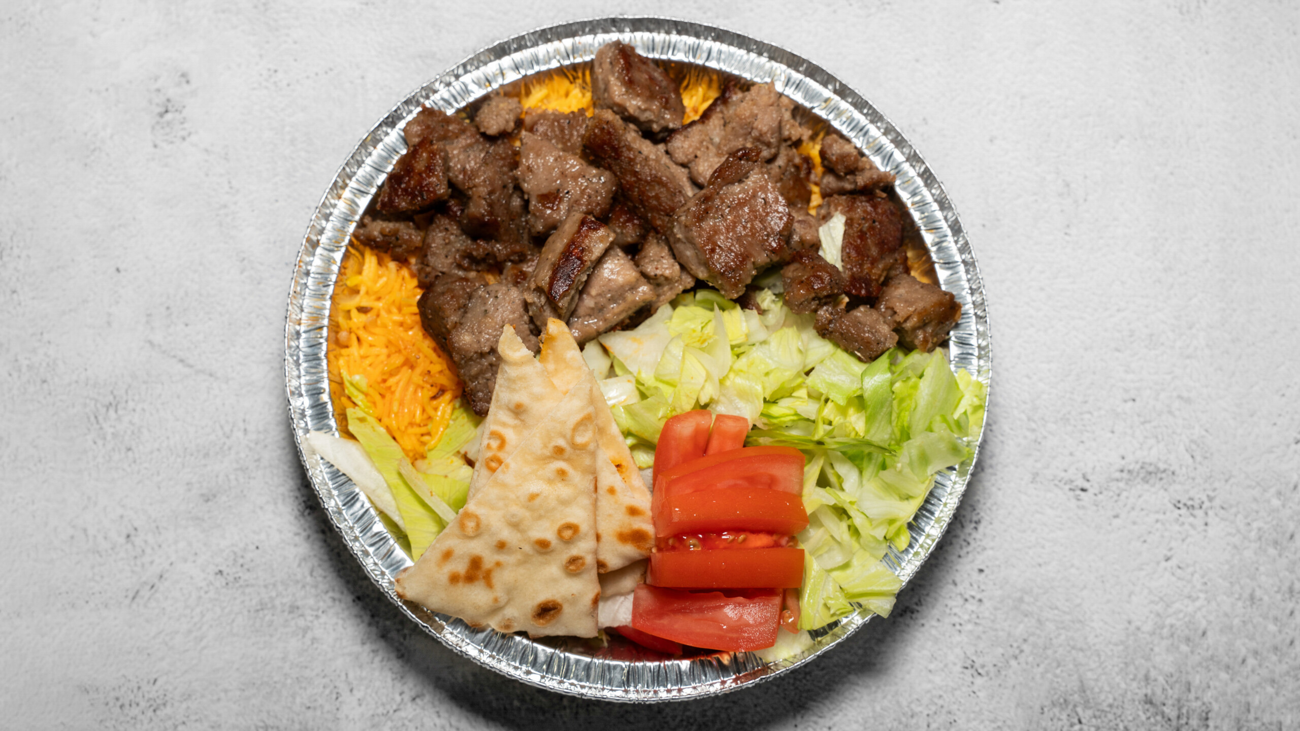 Marinated beef cooked on Char-Broil grill, served over saffron cilantro lime rice with fresh salad, tomatoes, hummus, house-made pickled onions, herbs, pita bread, and famous in-house crafted sauces. $16.50
